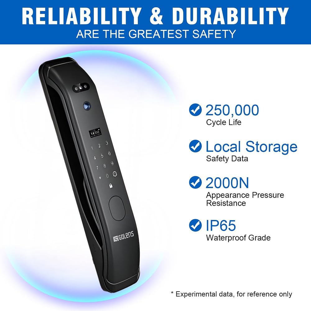 The Golens X57 Premium Smart Door Lock is a digital door lock equipped with advanced features such as 3D face recognition, Wi-Fi remote unlock using an app, fingerprint scanning, RFID card access, PIN entry, and a manual key option. Let's explore each of these features in more detail: