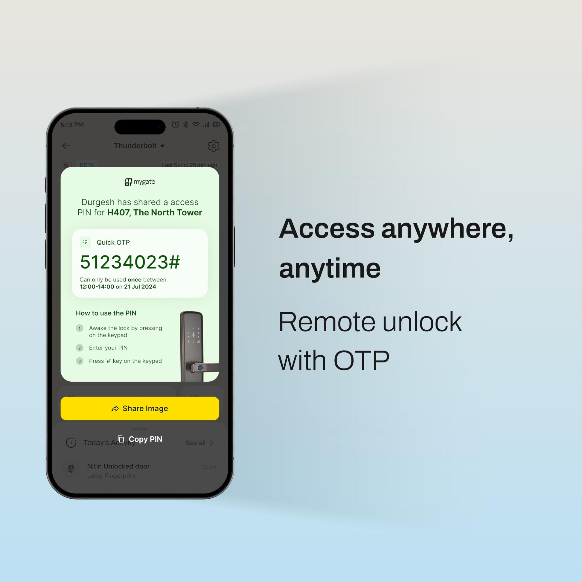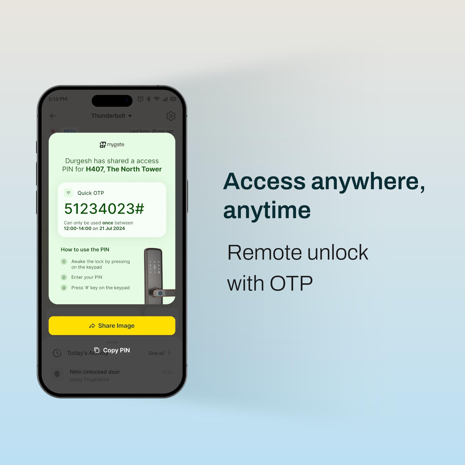- ๐ฆ๐ต๐ฎ๐ฟ๐ฒ ๐ฎ๐ฐ๐ฐ๐ฒ๐๐ ๐๐ถ๐๐ต ๐ฒ๐ฎ๐๐ฒ ๐ฎ๐ป๐๐๐ต๐ฒ๐ฟ๐ฒ: Effortlessly share access to your main door locks for home via OTP through WhatsApp, SMS, or email. Whether it's for house helps or guests, control entry with permanent, one-time, timed or recurring accessโall with a few taps on your smartphone.