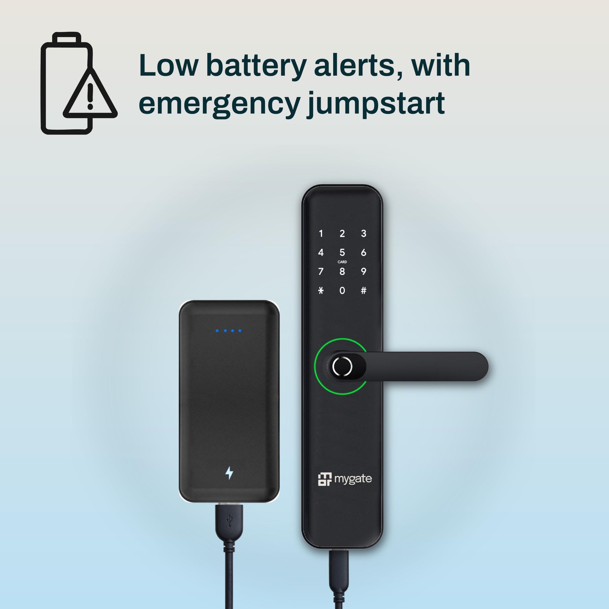 - ๐๐ผ๐ ๐ฏ๐ฎ๐๐๐ฒ๐ฟ๐ ๐ฎ๐น๐ฒ๐ฟ๐๐ & ๐ฒ๐บ๐ฒ๐ฟ๐ด๐ฒ๐ป๐ฐ๐ ๐ท๐๐บ๐ฝ-๐๐๐ฎ๐ฟ๐: Worried about battery life? This smart lock provides low-battery notifications and an emergency jump-start feature via C-type USB to ensure youโre never locked out, even in unexpected situations.