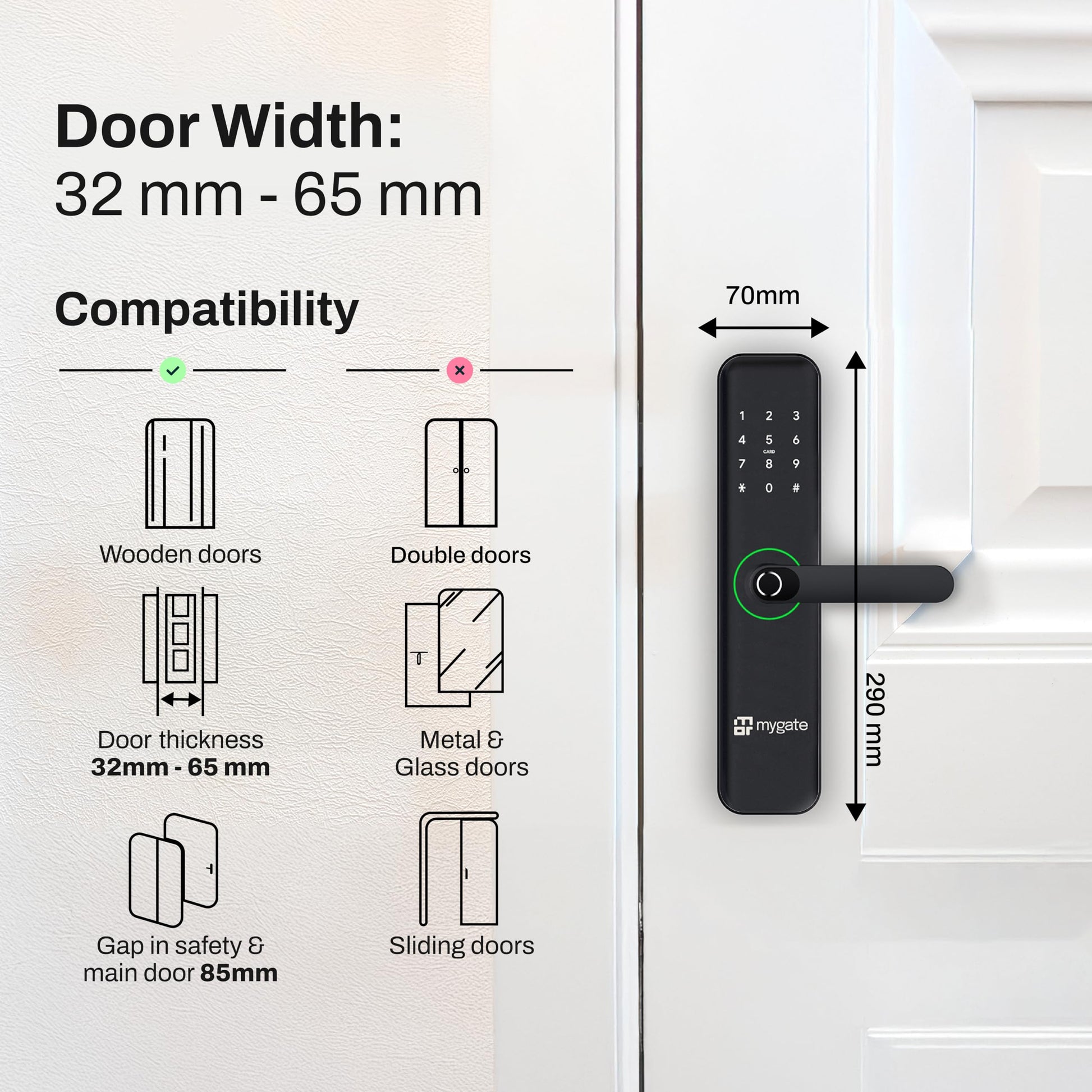 Yes, it supports 100+ fingerprints and PINs. You can generate time-based OTPs for guests. The Mygate app allows real-time access tracking and secure sharing. It fits standard wooden doors. Door thickness for SE- 32mm and for Plus- 35mm.