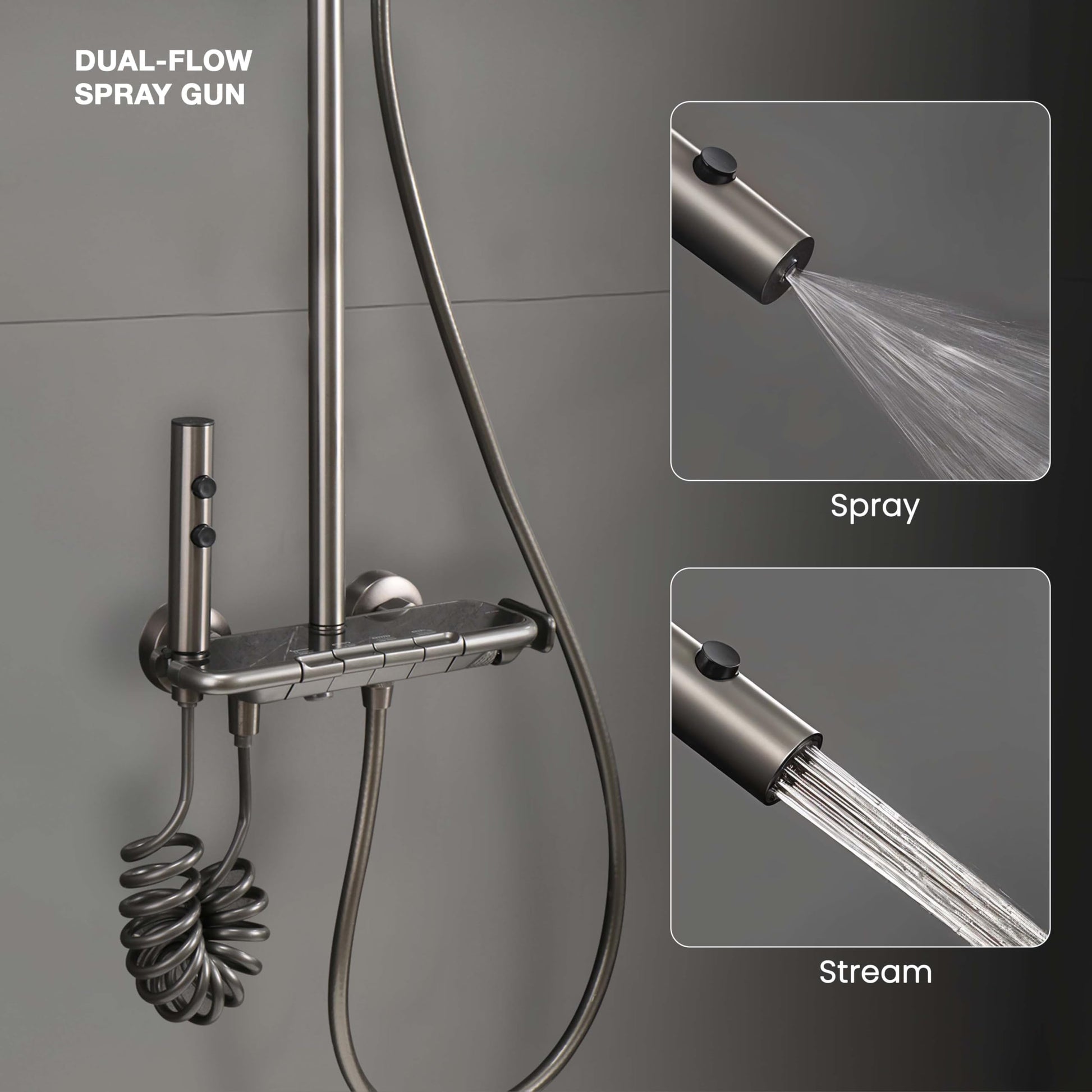 The hand shower and spray gun feature multiple flow modes, including rainfall, massage, and focus flow, to suit any mood or need.