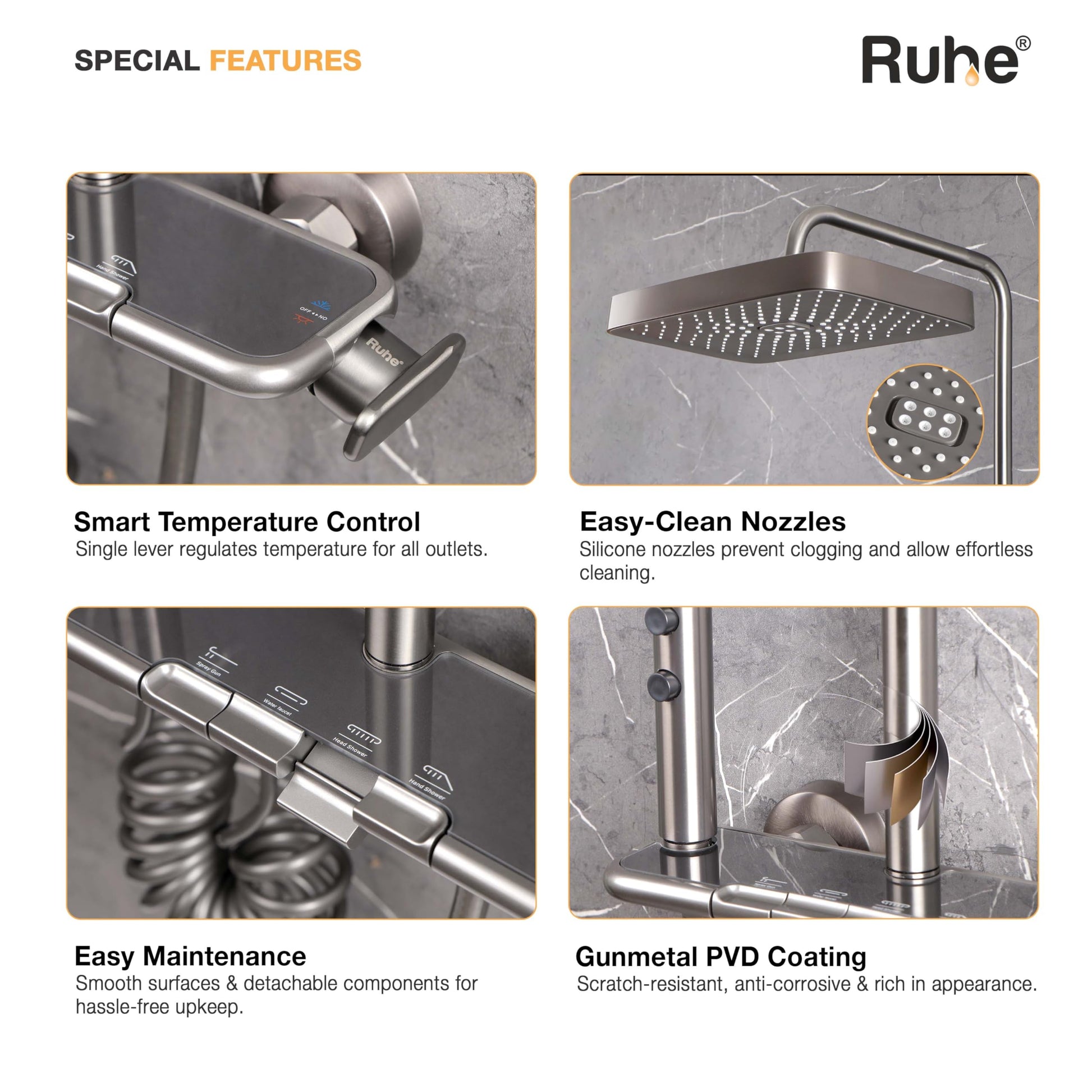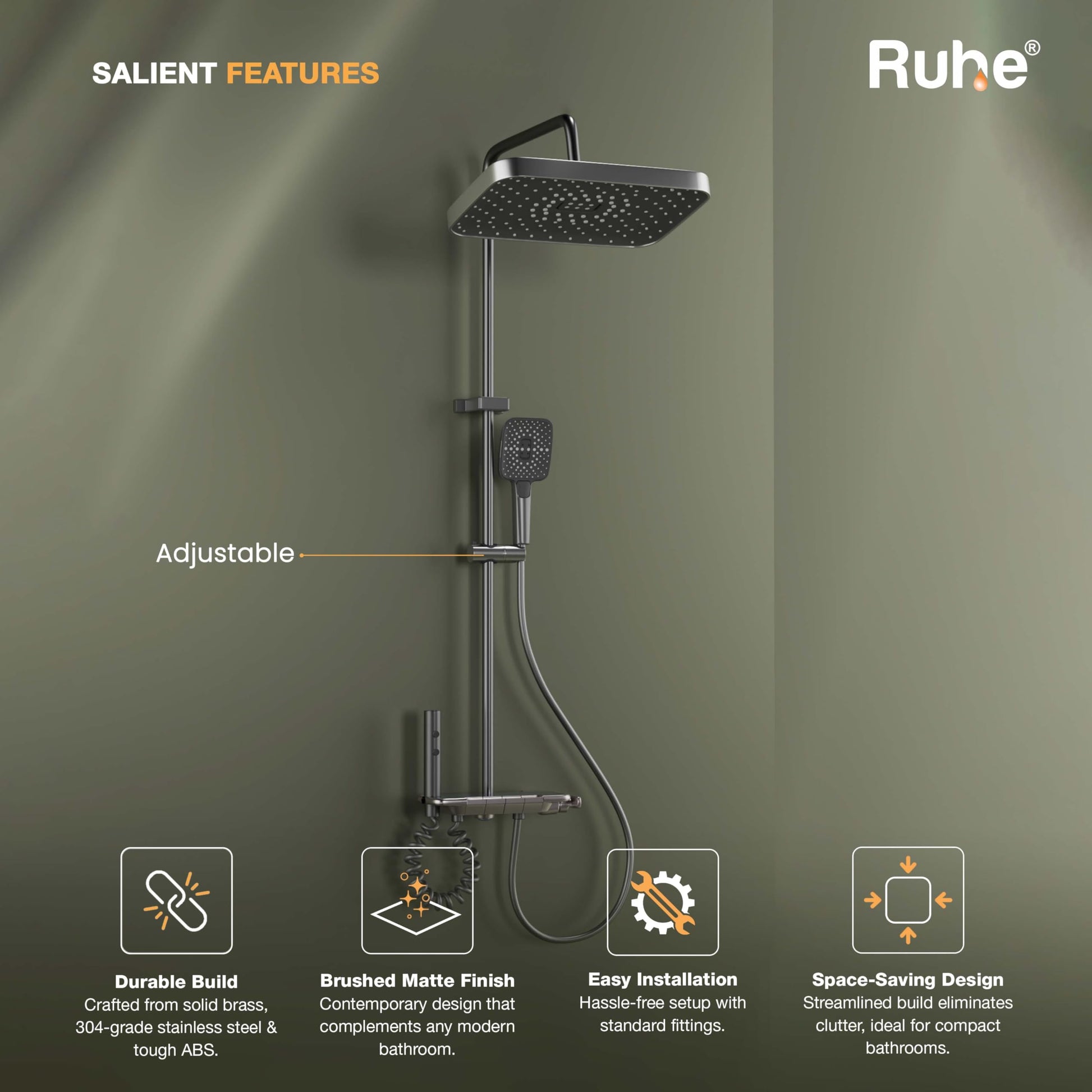Crafted from a robust mix of solid brass ingot, 304-grade stainless steel, and durable ABS, the Ripple Smart Shower Panel ensures long-lasting strength. The sleek brushed matte finish adds elegance while enhancing rust resistance and ease of maintenance.