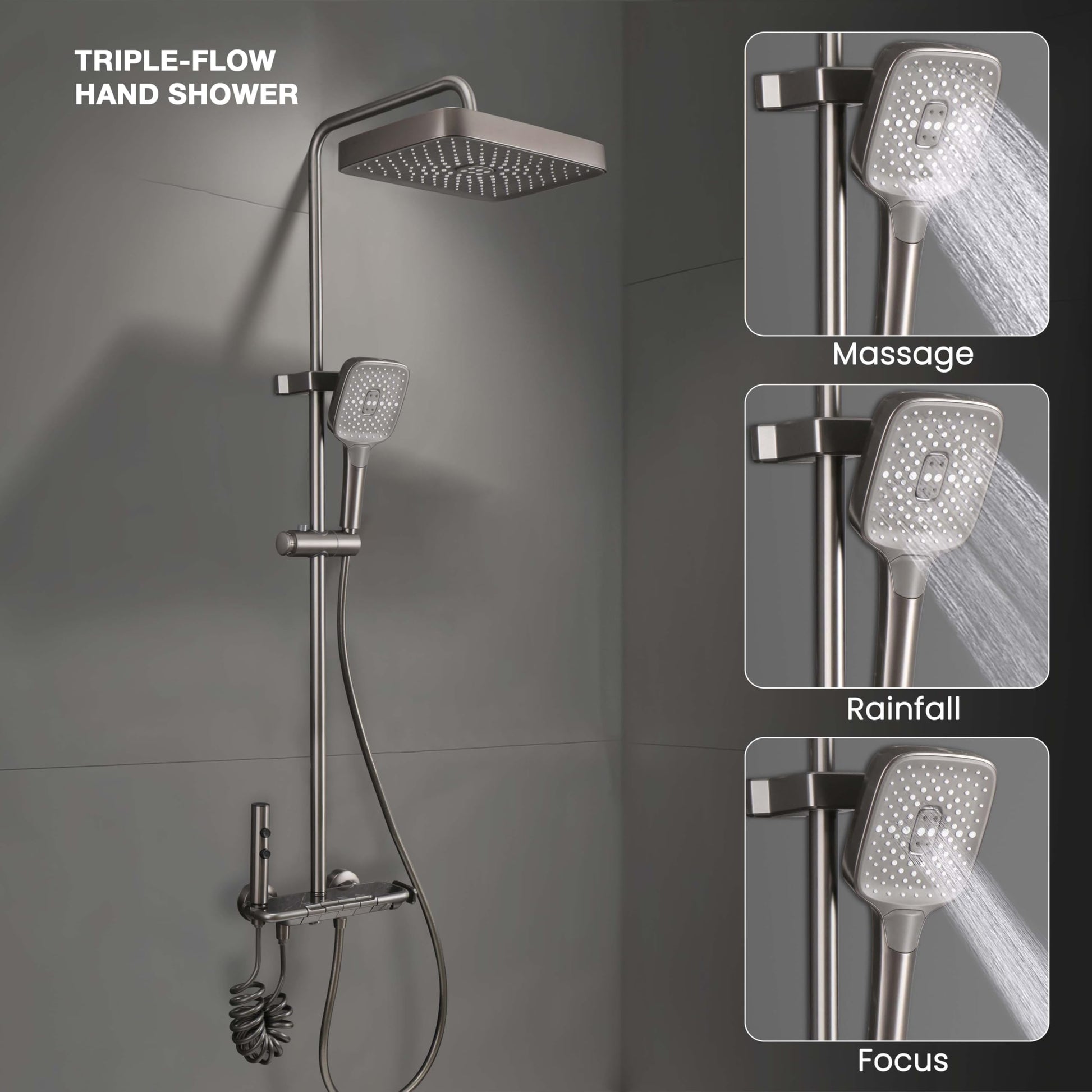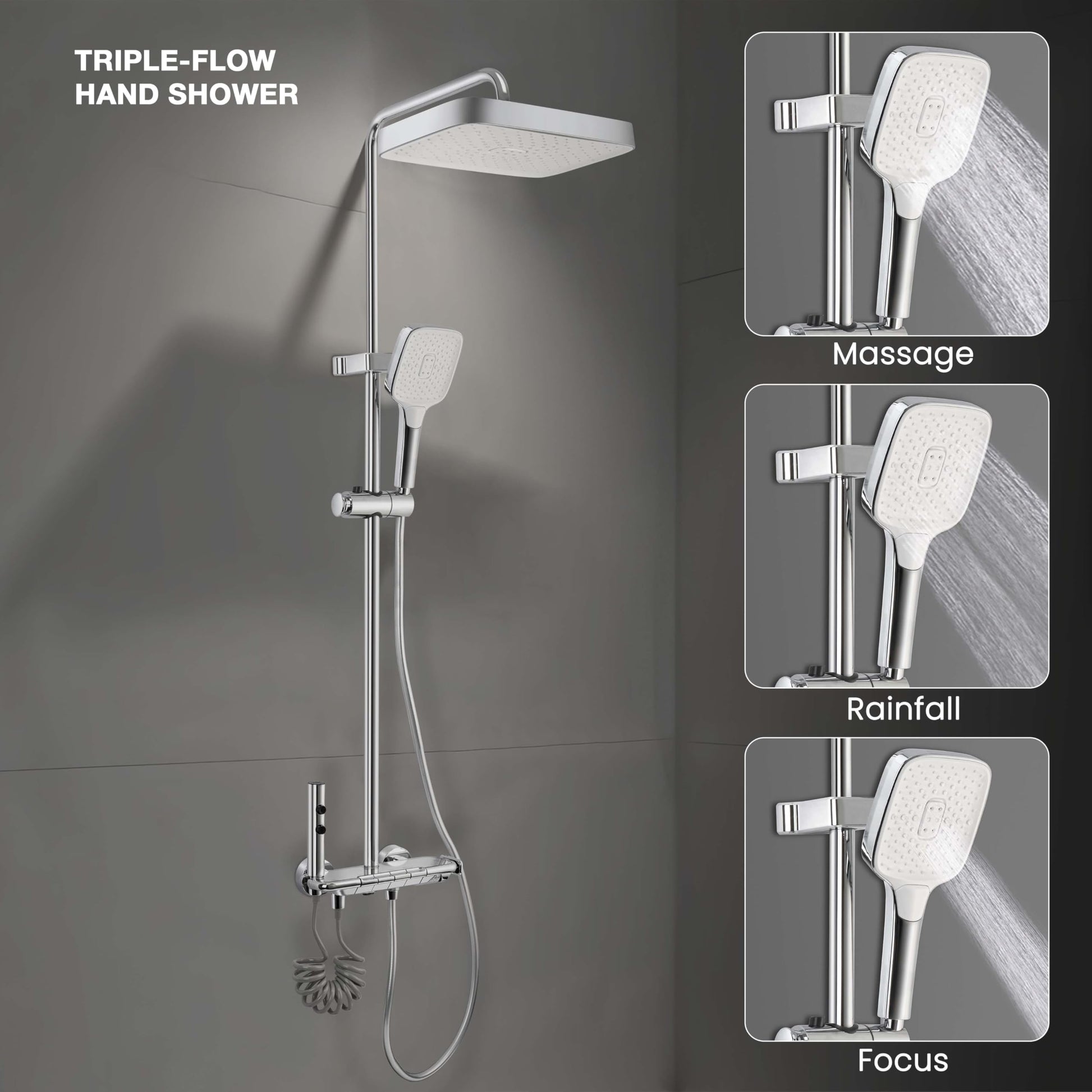 - 𝐓𝐑𝐈𝐏𝐋𝐄-𝐅𝐋𝐎𝐖 𝐇𝐀𝐍𝐃 𝐒𝐇𝐎𝐖𝐄𝐑: Designed with multiple spray options—rainfall, massage, and focus flow—to suit your every mood. Comes with its own hose and a height-adjustable holder so you can lift and angle it exactly where needed.
